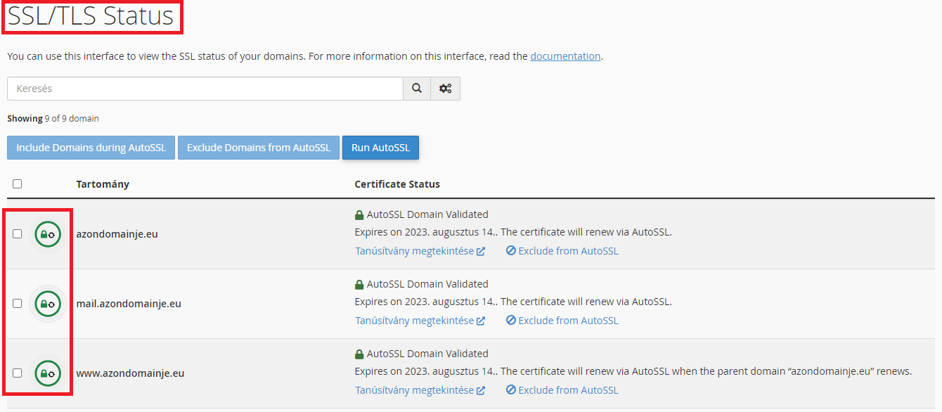 Először ellenőrizzük le cPanel / SSL/TLS Status fül alatt, hogy a szóban forgó domainhez települt-e az SSL.