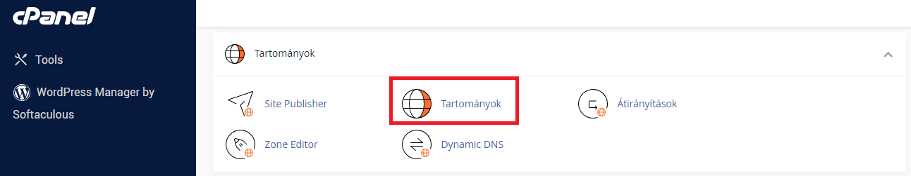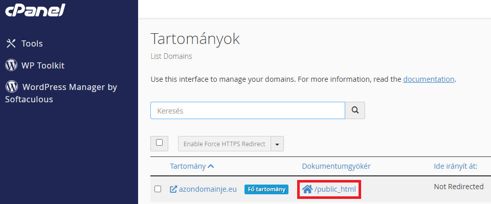 Ezt úgy találhatjuk meg a legkönnyebben és leggyorsabban ha cPanel / Tartományok fül alatt rákattintunk az oldalhoz tartozó dokumentumgyökér elérésére.
