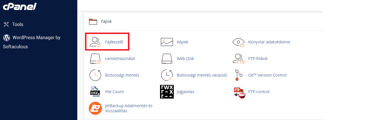 A másik opció ha cPanel / Fájlkezelő fülre rákattintunk és ott kattintunk rá az oldalhoz tartozó dokumentumgyökérre.