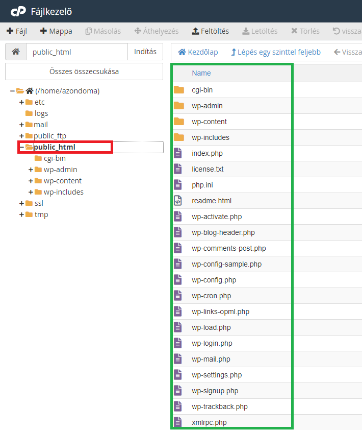 A zöldel megjelölt részen láthatjuk az oldalhoz tartozó mappákat és fájlokat.