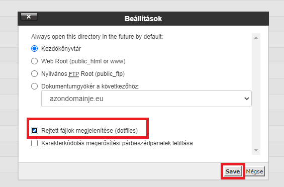 Az ezt követően megjelenő Beállítások fülön kattintsunk a Rejtett fájlok megjelenítése (dotfiles) előtt látható checkboxra majd mentsük a beállítást.