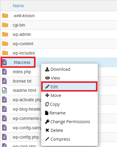 Kattintsunk a .htaccess fájlra jobb klikkel és válasszuk ki az Edit opciót.