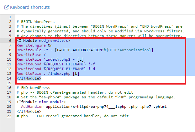 Ahogy azt korábban is leírtuk érdemes kimenteni még a módosítások előtt az egész .htaccess fájl tartalmát, így azt probléma esetén vissza tudjuk állítani az eredeti állapotba!