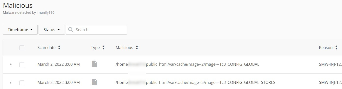 A listában lehetőség van a "Timeframe"-ra kattintva különböző időszakokra szűrni, továbbá a "Status"-ra kattintva a detektált fájlok státuszát illetően is lehetőség van szűrést beállítani, így egyszerűsítve a keresést.