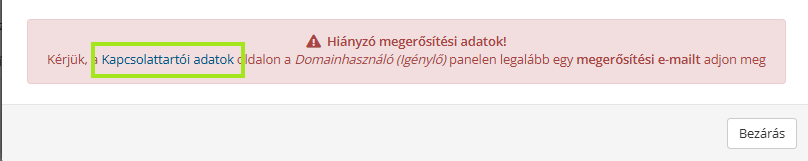Amennyiben a kapcsolattartói adatok nincsenek frissítve, abban az esetben a felület erre figyelmezteti. Ebben az esetben el kell végeznie a frissítést.