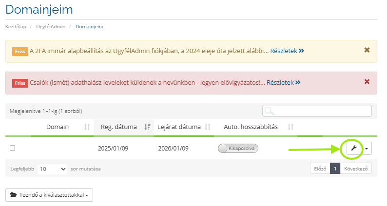 A domain sorának jobb oldalán keresse meg a villáskulcs ikont, és kattintson rá.